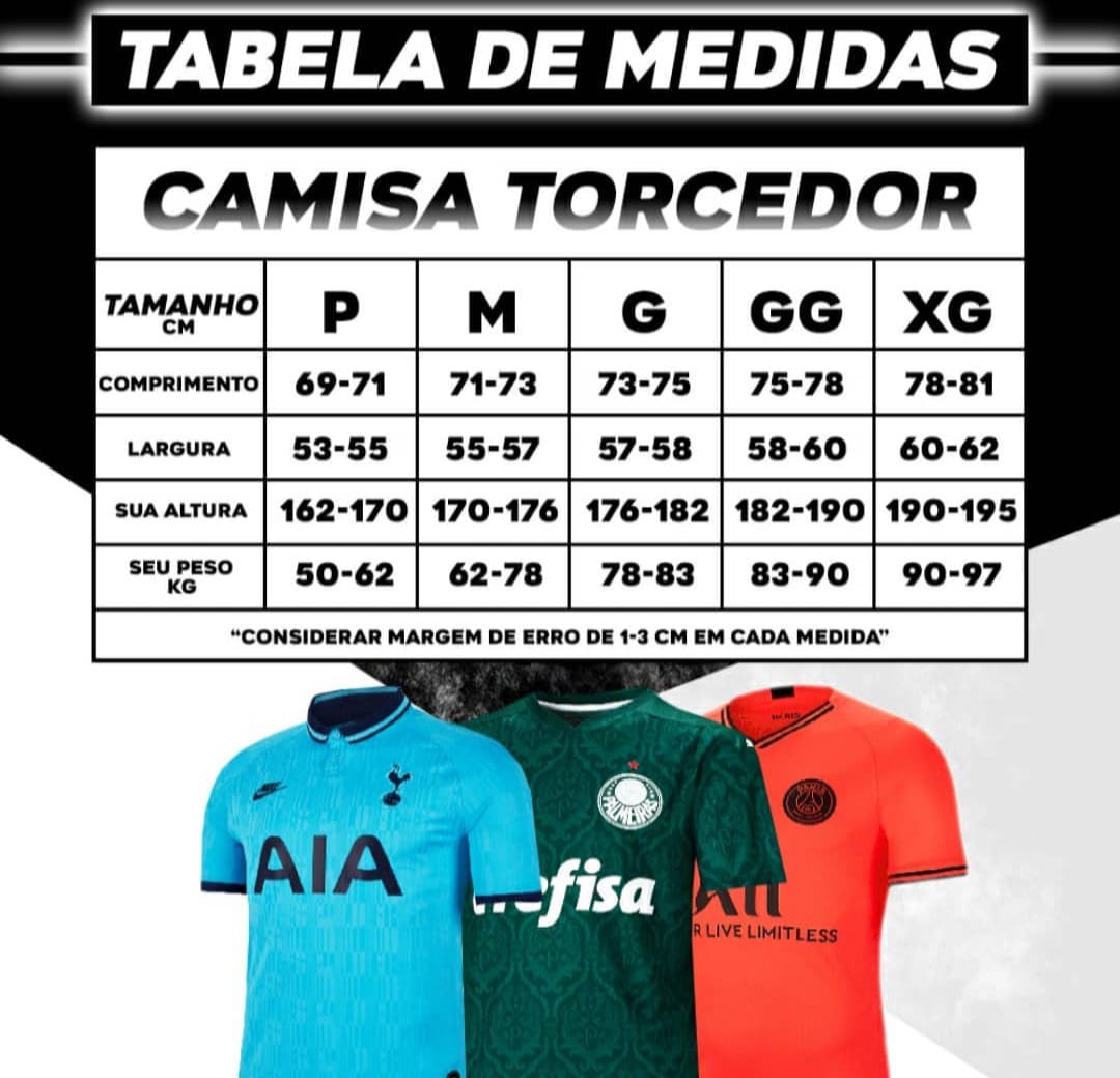 *TAMANHOS; O IDEAL DE TAMANHO PARA VERSÃO TORCEDOR É O TAMANHO QUE VOCÊ USA NORMALMENTE. SEGUE ABAIXO A TABELA DE TAMANHOS.