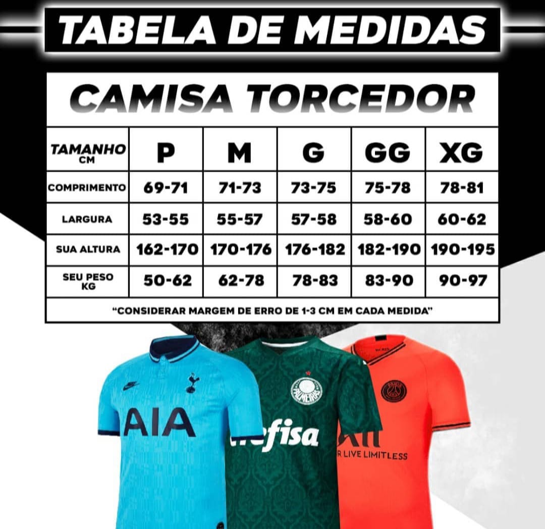 *TAMANHOS; O IDEAL DE TAMANHO PARA VERSÃO TORCEDOR É O TAMANHO QUE VOCÊ USA NORMALMENTE. SEGUE ABAIXO A TABELA DE TAMANHOS.